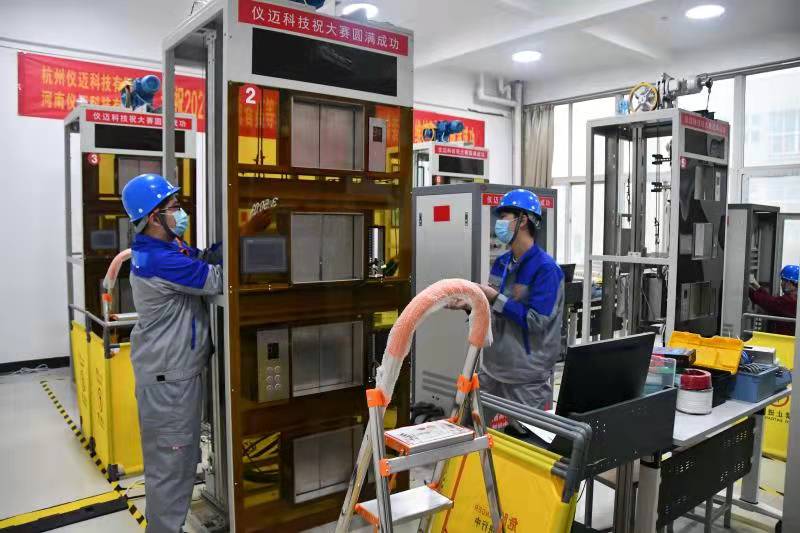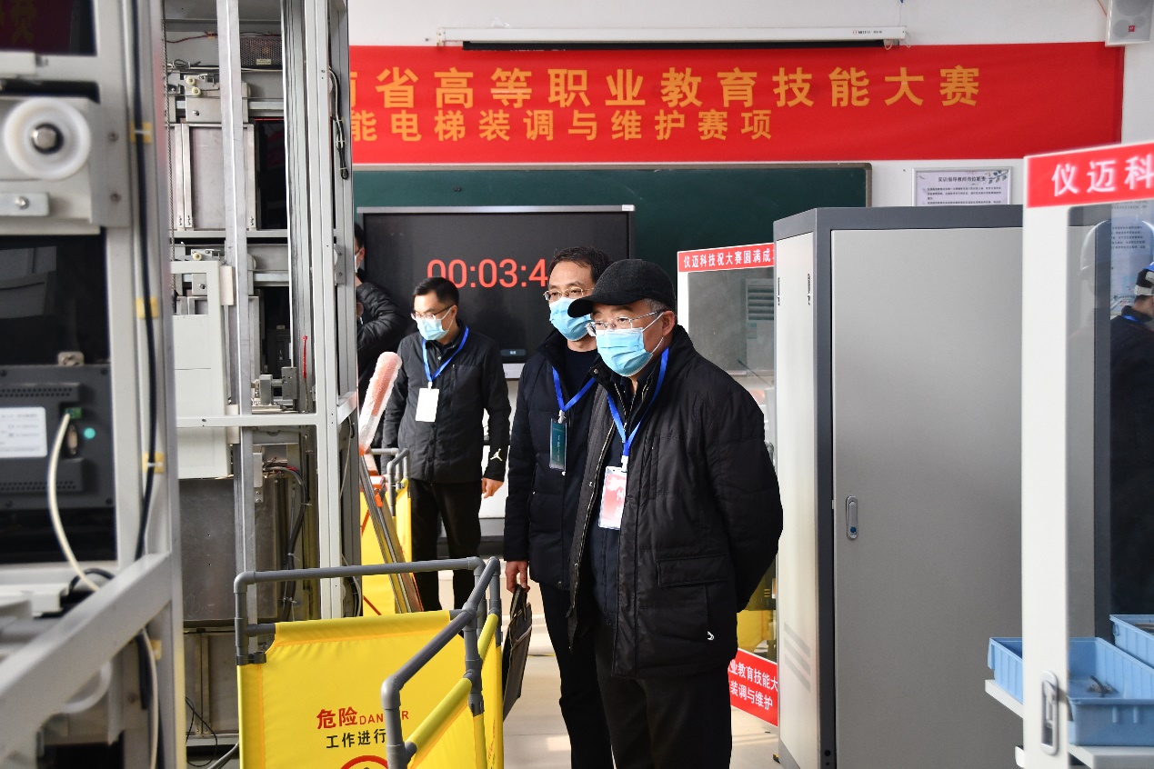 大赛仲裁新乡职业技术学院副校长赵金周在智能电梯装调与维护赛项比赛现场