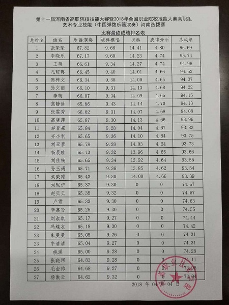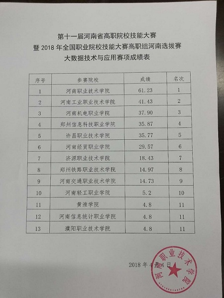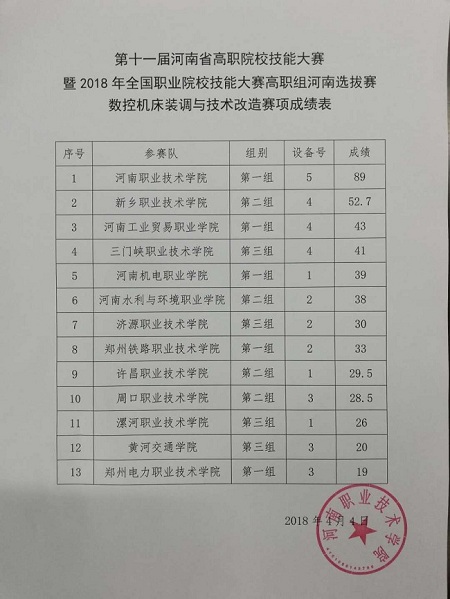 2018年全国职业院校技能大赛高职组河南省选拔赛数控机床装调与技术改造、大数据技术与应用、艺术专业技能(弹拨乐器演奏)三个赛项于2018年4月2日—4日在我院举行,现就三个赛项比赛成绩进行公示,公示期4月4日—4月6日。