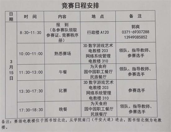 根据豫人社职业【2018】4号文件精神和《88858cc永利第45届世界技能大赛郑州市选拔集训工作的通知》的相关要求,第45届世界技能大赛郑州市选拔赛将于3月中旬举办。88858cc永利承办网络系统管理、3D数字游戏艺术两个赛项。请各参赛队于3月15日上午来校报到,竞赛时间3月15日下午13:30-17:30。现就竞赛日程安排及温馨提示公布如下: